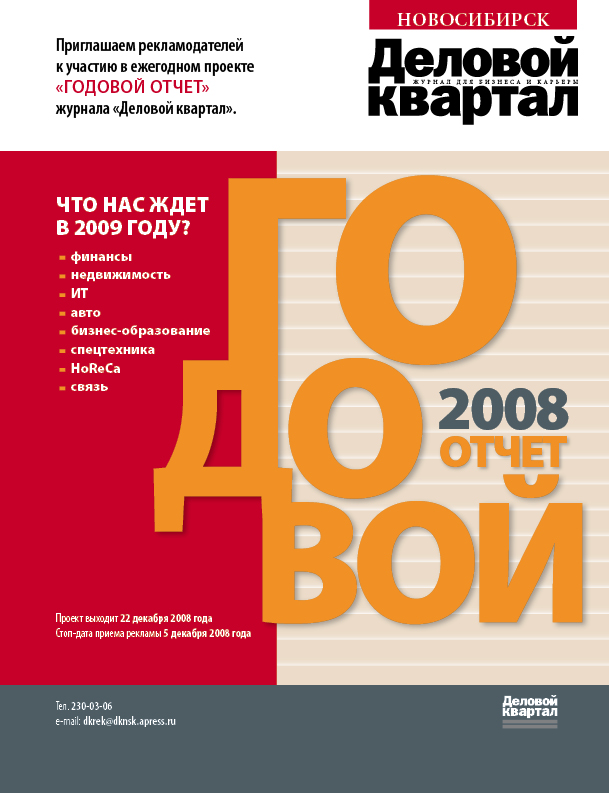 В «Годовом отчете» журналисты «Делового квартала» назовут самых динамичных и ярких игроков новосибирского бизнеса, выделят основные события 2008 года на ключевых рынках: финансы, недвижимость, IT, связь, рынок авто, бизнес-образование, ритейл, HoReCa, спецтехника и др. Материалы будут содержать максимальное количество прогнозов на 2009 год, причем от лица реальных успешных собственников и управленцев.