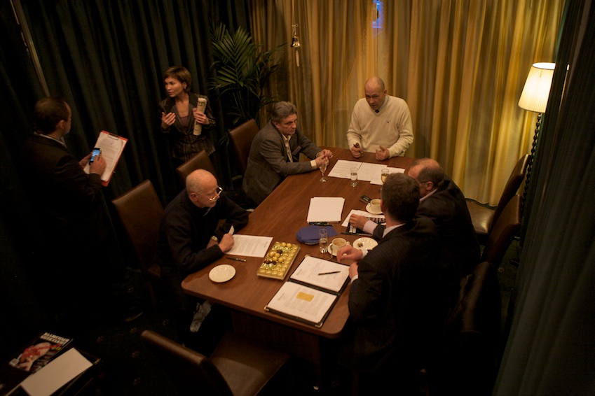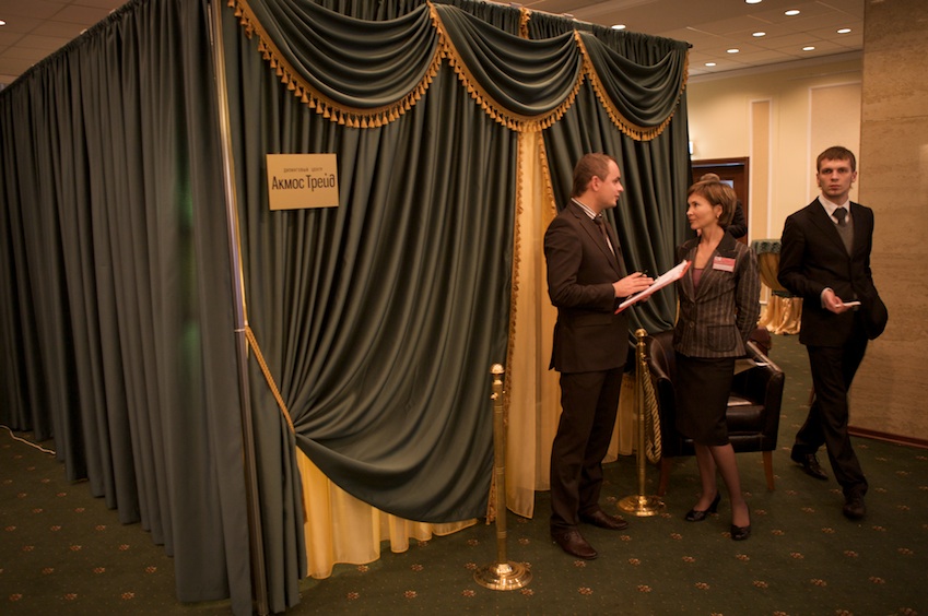 Закрытый стенд представлял собой воплощение идеи позиционирования компании — элитный клуб для опытных трейдеров. Интерьер в английском стиле, напитки, все это создавало приятную располагающую к беседе атмосферу. С экспертами на стенде персонально работали ведущие менеджеры и руководители «Акмос Трейд». За чашечкой кофе велись дискуссии о перспективах работы на рынке и новых проектах дилингового центра. Трейдеры находились на стенде одновременно группами по 5 человек, в среднем по 30 минут. За ходом беседы и соблюдением регламента следил ведущий.
