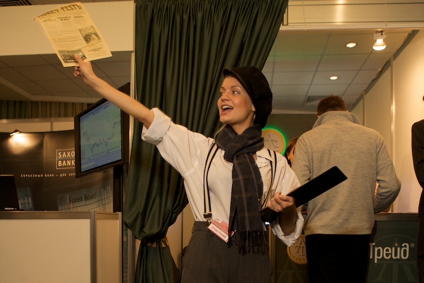 Специально к выставке был написан «Money Festъ» — листовка, стилизованная под первую страницу газеты, броские заголовки которой анонсировали новые проекты компании и провоцировали интерес к происходящему на закрытом стенде. Раздавал «Money Festъ» промоутер в образе мальчишки-газетчика.