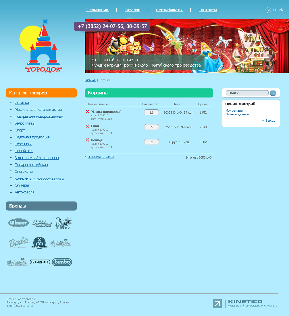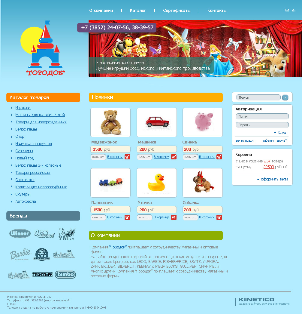 Агентством «Кинетика» разработан интернет-магазин для одного из ведущих оптовых поставщиков детских товаров в Барнауле, фирмы «Городок». За 12 лет работы «Городок» установил стабильные партнерские отношения с крупнейшими производителями, что позволяет постоянно обновлять ассортимент качественной и безопасной продукцией: сейчас вниманию посетителей сайта представлено более 10 000 наименований товаров.