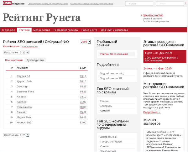 Окончательные результаты рейтинга — ТОП-50 SEO-компаний Рунета, будут публично представлены в январе 2010 года. Промежуточные результаты уже доступны в режиме реального времени на странице проекта «Рейтинг Рунета» ).