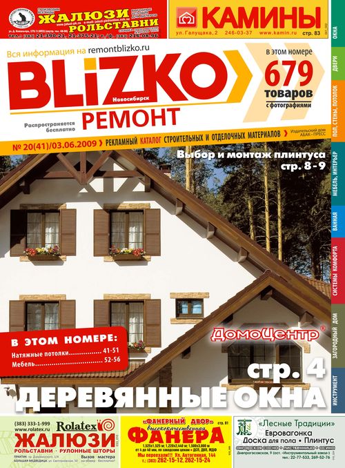 «BLIZKO Ремонт» – сеть бесплатных каталогов строительных и отделочных материалов для конечного потребителя. Выпускается ИД «АБАК-ПРЕСС» в Новосибирске, Екатеринбурге, Самаре, Нижнем Новгороде, Казани, Ростове-на-Дону. Совокупный ежемесячный тираж в Новосибирске – 60000 экземпляров.