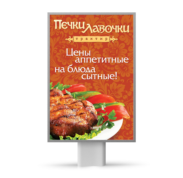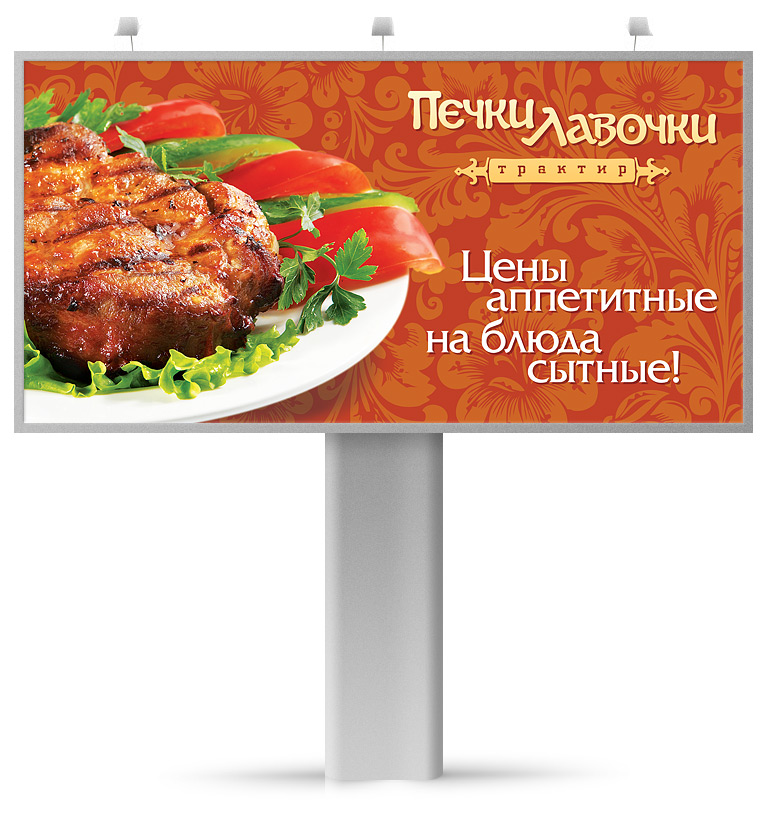 Для информирования целевой аудитории сети трактиров об этих конкурентных преимуществах рекламным агентством L.A.B. была создана креативная концепция с рекламным слоганом и разработан генеральный дизайн-макет, который использовался при оформлении билбордов, щитов сити-формата, а также меню сети трактиров.