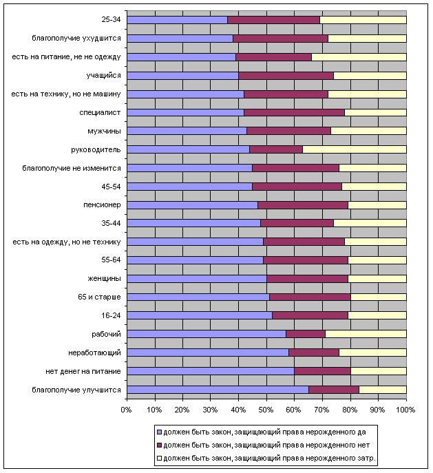 Сторонники закона чаще встречаются среди людей старше 45 лет рабочих специальностей, считающих, что в ближайшее время их семейное благополучие улучшится. Противники – среди опрошенных горожан в возрасте от 25 до 35 лет, специалистов, ждущих ухудшения благополучия. (Более подробно социально-демографическая структура приведена в Диаграмме 1).