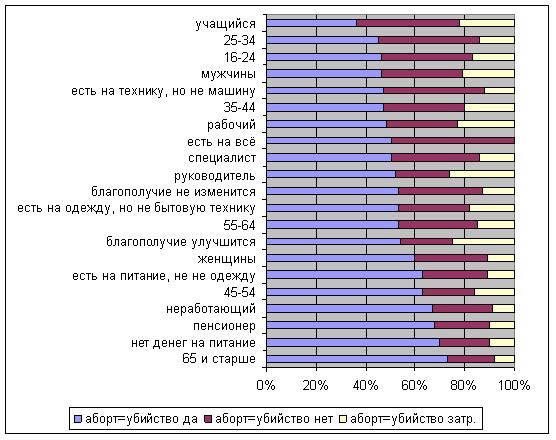 Мнения по значимости абортов несколько консолидированнее, чем по законодательству: 53% респондентов считают аборт убийством, 31% таковым его не считает, 16% затруднились с ответом. Реже других склонны приравнивать прерывание беременности к убийству учащиеся и работающие мужчины в возрасте до 35 лет со средним достатком. Чаще других – женщины-пенсионерки с низким уровнем дохода. (Более подробно социально-демографическая структура приведена в Диаграмме 2).