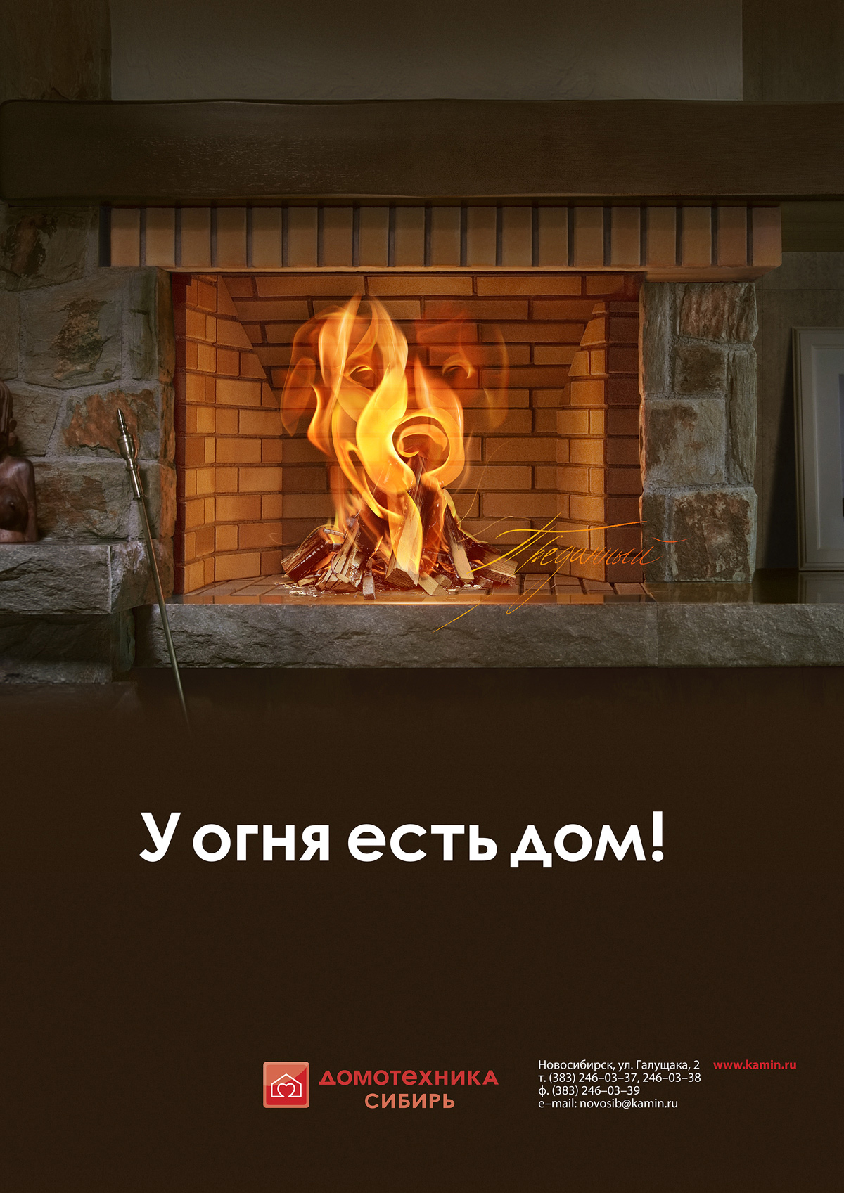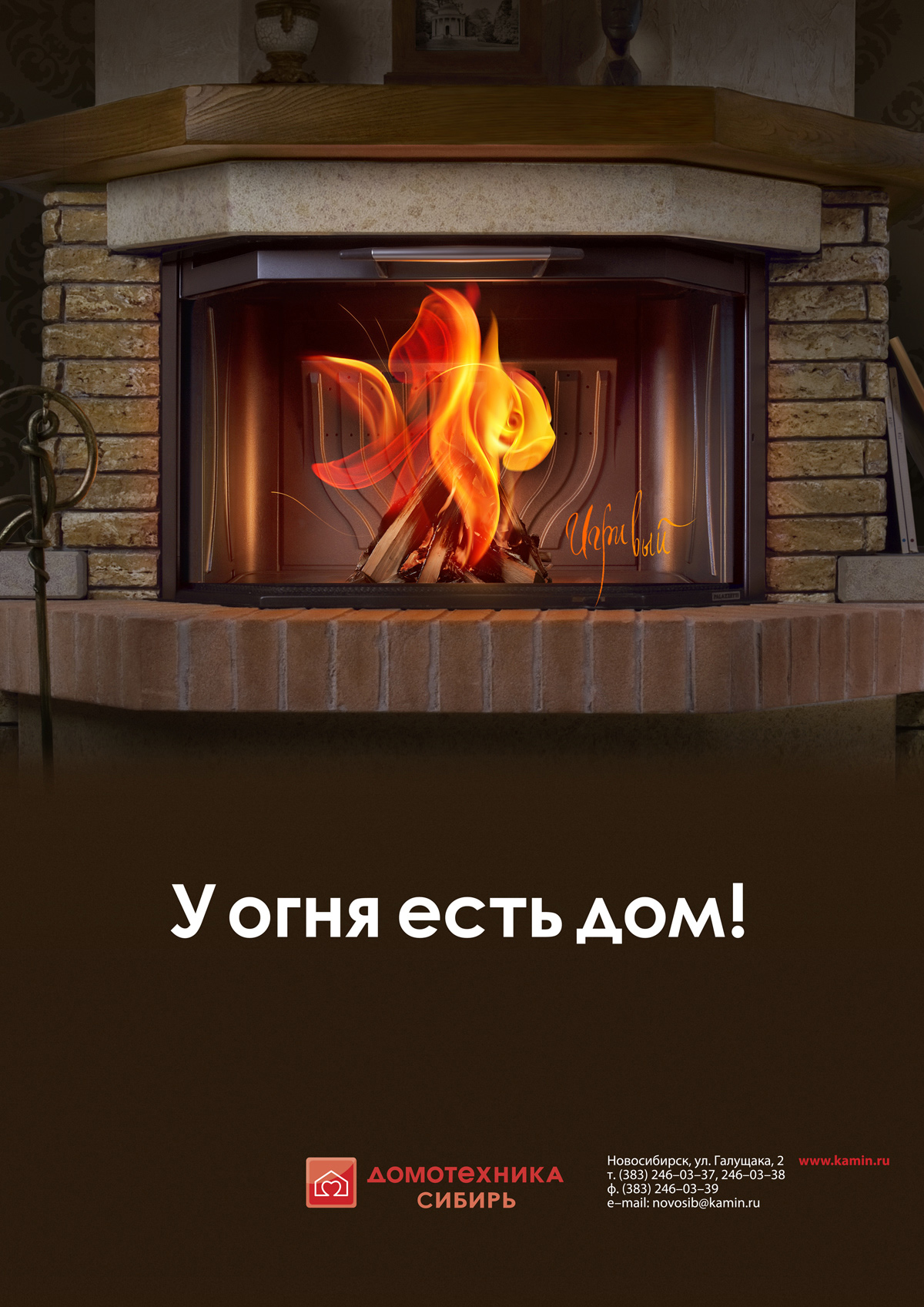 В основе идеи — сравнение огня с любимым домашним питомцем: собакой, кошкой и рыбкой. Огонь так же можно «завести», но сначала для него нужен дом — камин из «Домотехники».