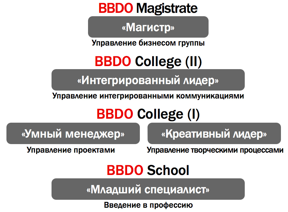 Проект состоит из четырех ступеней, рассчитанных на специалистов разного уровня и разных специальностей. Большинство курсов создано для уже действующих сотрудников BBDO, кроме самого первого, вводящего в профессию. В BBDO School учатся как уже работающие в агентствах BBDO стажеры и экзеки, так и перспективные выпускники вузов, прошедшие конкурсный отбор. По сути BBDO School — это еще одна точка входа в индустрию для будущих менеджеров, стратегов и аналитиков.