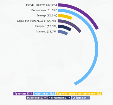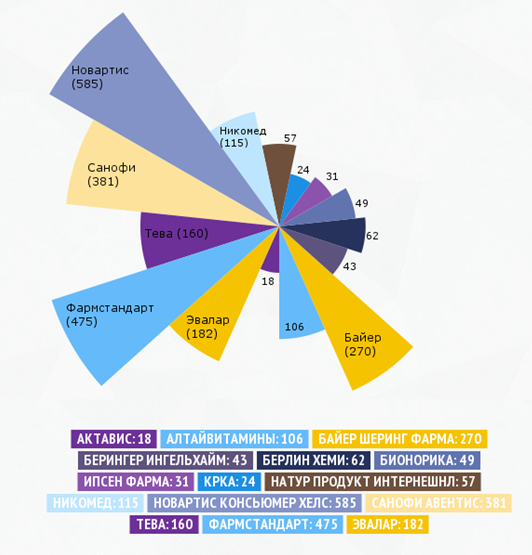 Например, интересно проследить статистику упоминаемости компаний в публикациях о политическом лобби определенных фармацевтов. Чаще всего данные новости посвящены развитию здравоохранения в России и госзакупкам импортных лекарств. Безусловно, в статьях с данной тематикой часто упоминаются иностранные фармацевтические компании, имеющие представительства в России. Но помимо них наиболее часто редакции в качестве примера приводят крупнейшего российского производителя лекарственных препаратов «Фармстандарт».