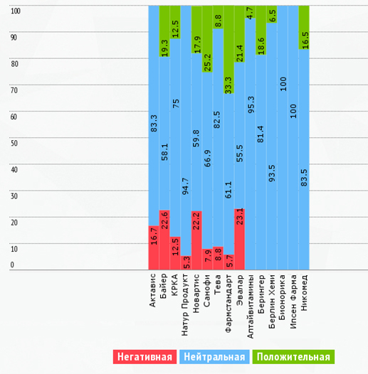 По количеству негативных упоминаний в первую тройку входят компании «Эвалар», «Байер», «Новартис». У тройки лидеров большинство негативных упоминаний прослеживаются в следующих тематиках: «корпоративная ответственность» (Эвалар), «Продукты/услуги» (Байер) и «Менеджмент» (Новартис). Самый яркий инфоповод в диапазоне негативных упоминаний тройки лидеров у компании Байер: приём контрацептивов, производимых фирмой Байер, может осложниться различными побочными действиями.