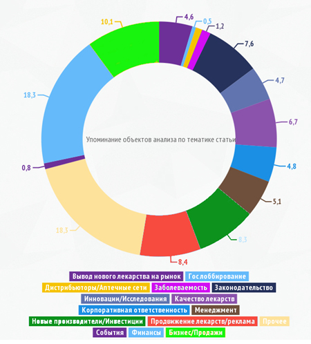В ходе исследования также определялась общая тематика публикации, содержащей объект анализа. Из всего массива проанализированных публикаций с упоминанием объектов анализа больший процент статей (18,3%) приходится на тематику «Корпоративная ответственность». В эту тематику входят сообщения  об общепринятых стандартах и нормах фармотрасли, о качестве профессиональной подготовки специалистов, а также о практике испытания лекарственных средств.