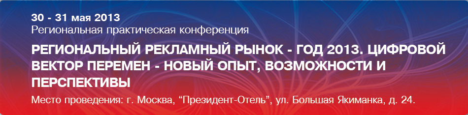 Российская ассоциация «Рекламная Федерация Регионов» 30-31 мая 2013 года в Москве проводит ставшую традиционной майскую практическую конференцию «Региональный рекламный рынок – год 2013. Цифровой вектор перемен – новый опыт, возможности и перспективы».