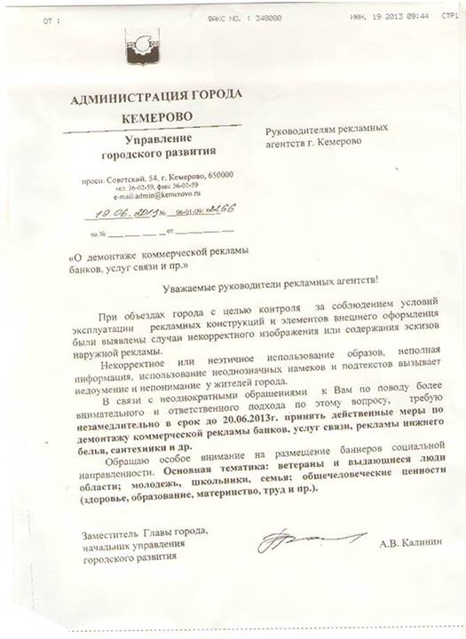 19 июня 2013 года рекламные агентства города Кемерово получили следующий факс от Управления городского развития Администрации города.