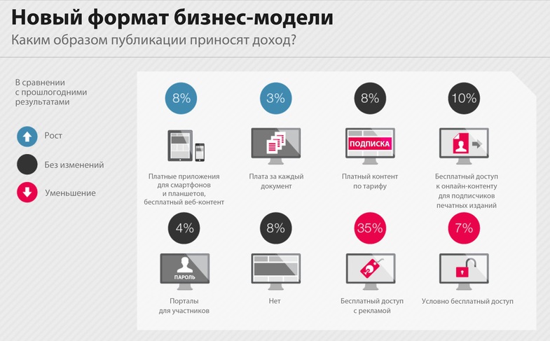 40% информагентств используют мобильные приложения для монетизации контента (платный доступ), считают исследователи, и это почти вдвое больше чем 2 года назад. С 2012 года на треть выросло использование премиум-приложений для этих целей, в то время как использование ранее доминирующей модели монетизации контента – рекламы – начинает замедляться. Бесплатный доступ к информации, основанный лишь на доходах от рекламы, конечно, пока имеет место быть, но его популярность переживает небольшой спад – с 38% в 2012 году до 35% в этом году.