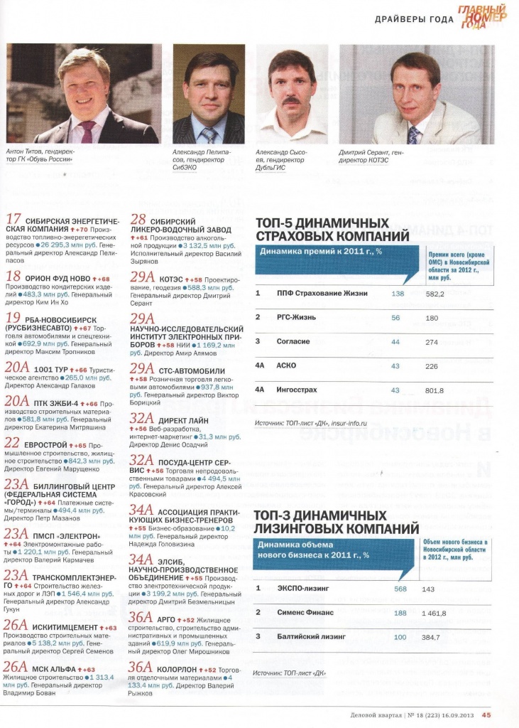 16 сентября 2013 г. журнал «Деловой квартал» опубликовал рейтинг самых динамичных компаний Новосибирской области. Чтобы отобрать их «ДК» проанализировал выручку тысячи новосибирских компаний. В ТОП-лист драйверов года вошли компании, показавшие увеличение оборота в 1,5-2 раза, а иногда и более, по сравнению с динамикой 2011 года.