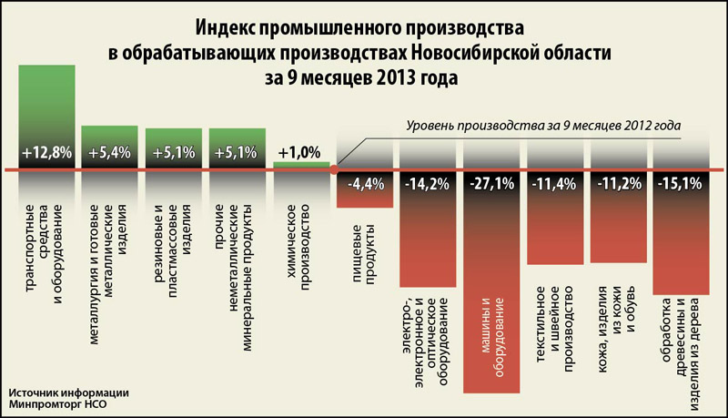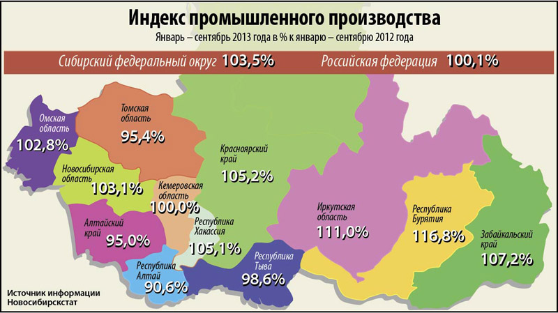 За 9 месяцев (январь-сентябрь 2013 года) индекс промышленного производства по Новосибирской области составил 103,1% против 100,1% в целом по России. Напомним, что индекс промпроизводства региона по итогам полугодия 2013 года составлял 104%.