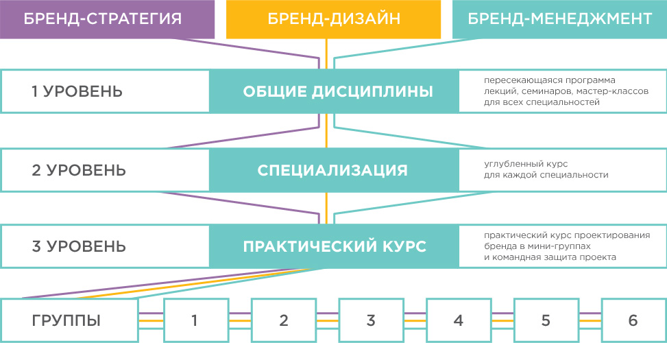Уникальная кроссдисциплинарная программа школы построена на объединении трех ключевых специализаций профессии и состоит из последовательных уровней. На первом этапе студентам всех специальностей преподается пересекающаяся программа лекций, семинаров и мастер-классов. На втором – углубленный курс по выбранным специализациям. Третий уровень предусматривает практический курс проектирования бренда в группах и командную защиту проекта.