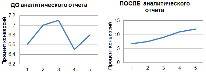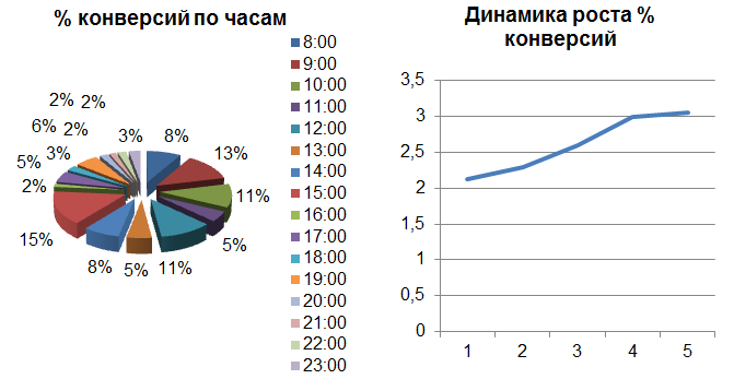 Рассмотрим эффективность отслеживания показателей для конверсионных задач на примере одного банковского продукта. Ежедневно, каждые 3 часа проводился мониторинг показателей отказов и процента целевых посещений по заданным параметрам гео, пола и возраста в рекламных кампаниях. Объявления с процентом отказов более 45% отключались, а по проценту целевых посещений изменялись ставки (в зависимости от %) объявлений. В результате, за короткий промежуток времени удалось снизить стоимость конверсии на 200 рублей. Также, по статистике за 3 месяца, были выявлены наиболее конверсионные часы. Менеджер разгонял РК, поднимая ставки в наиболее конверсионные часы, и затормаживал в наименее конверсионные. Благодаря этому был существенно снижен нерациональный расход средств.