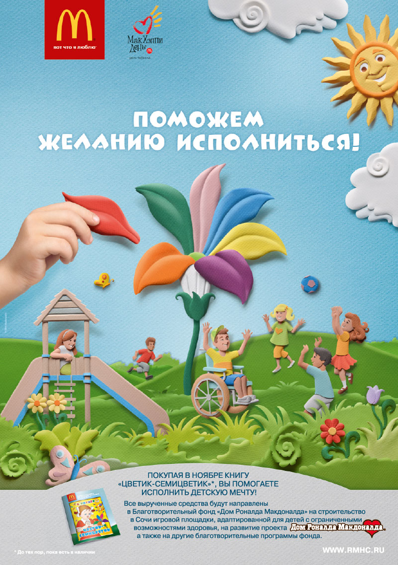 Компания «Макдоналдс» в России и Leo Burnett Moscow запустили рекламную кампанию «Заветное желание» в поддержку ежегодной благотворительной акции «МакХэппи День», чтобы собрать средства на строительство в Сочи игровой площадки адаптированной для детей с ограниченными возможностями здоровья.