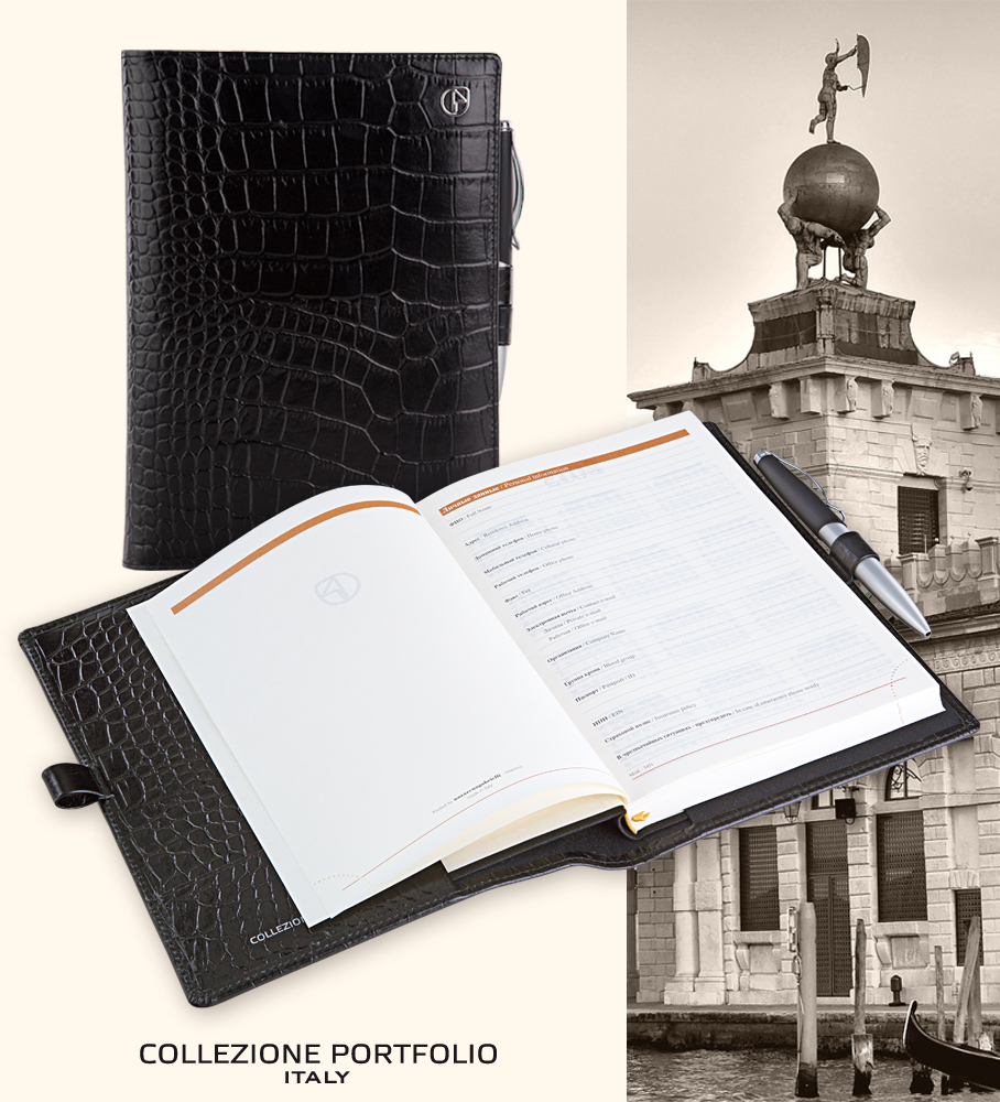 Характерная черта Портфолио Clip Crocco — классическая выделка обложки под кожу крокодила. Следует отметить удивительно интересную дизайнерскую находку по оформлению застежки: особый крой обложки позволяет фиксировать её в закрытом состоянии с помощью ручки nazarenogabrielli, прекрасно дополняющей элегантный стиль Портфолио Clip Crocco.