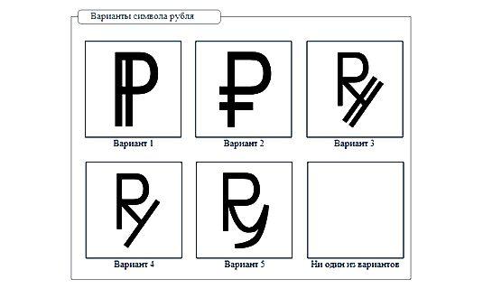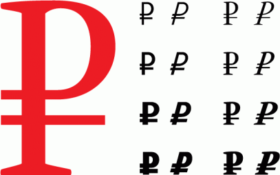 После проведения конкурсов и анализа результатов был выбран один символ. Им стала буква «Р» с перечёркнутой ниже полукруга ножкой. Автором оригинального шрифта символа считается художник-шрифтовик Александр Тарбеев, хотя такие же знаки нарисовали 12 других авторов. Популяризаторами же придуманного символа стали Артемий Лебедев, Юрий Гордон и Эркен Кагаров. Вскоре этот логотип ушел в народ и неформально стал использоваться на ценниках, в интернет-магазинах и различных рекламных постерах.