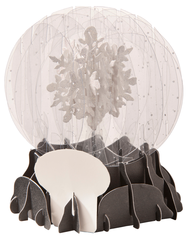 Одно движение руки превращает ее из плоской открытки в объемный «снежный шар» с белой, словно точеной, снежинкой внутри. Настоящее воплощение легкости и изысканности.