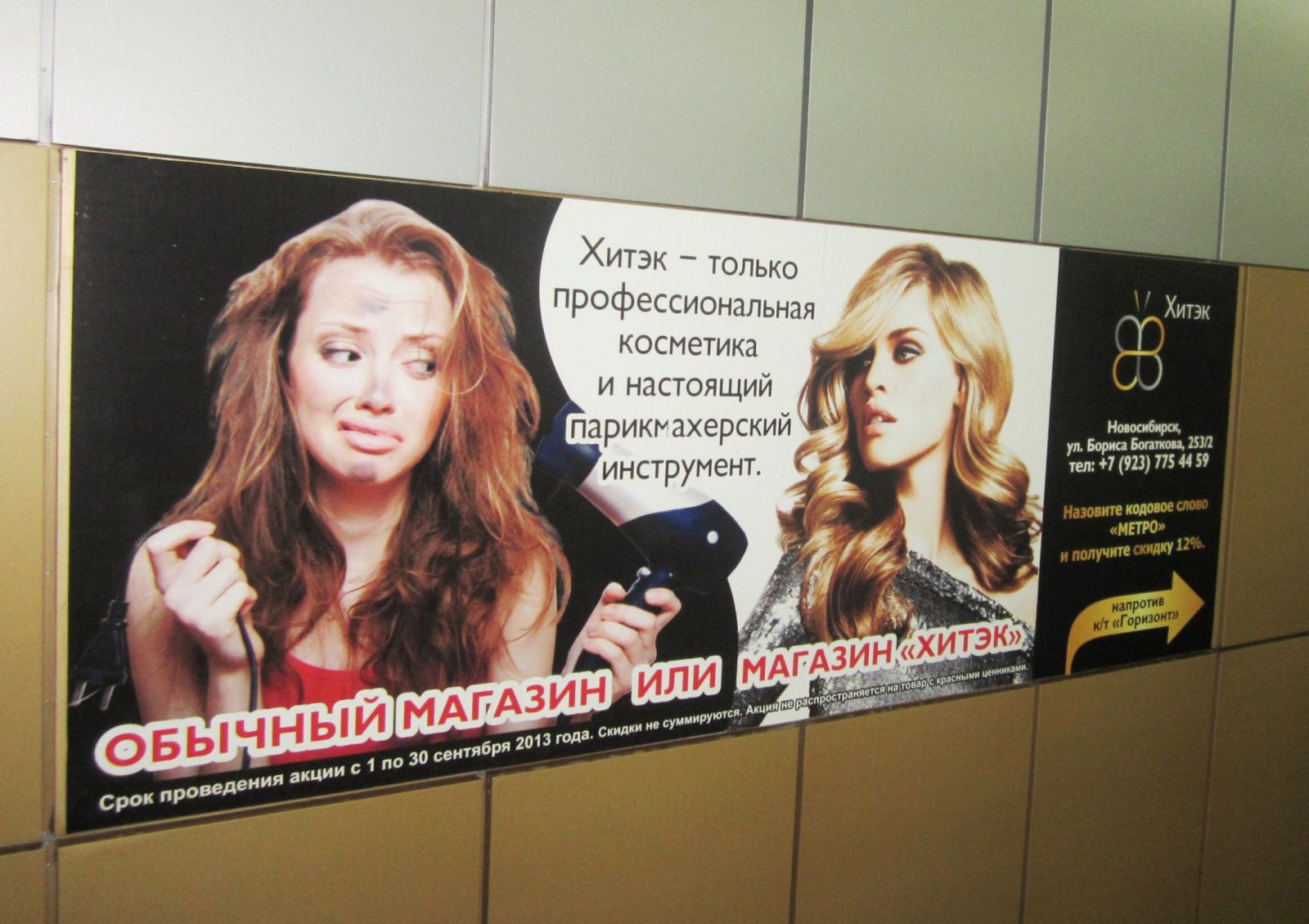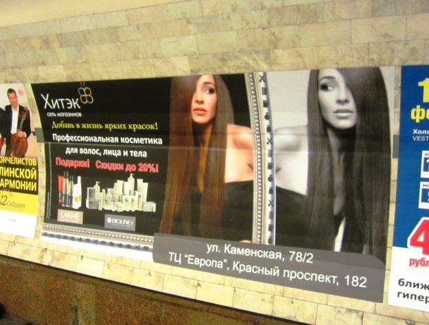 В течение пяти месяцев 2013 года в метрополитене Новосибирска рекламное агентство «Нью-Тон Сибирь» размещало имиджевую рекламную кампанию для сети магазинов «Хитек-Групп», посвященную новым акциям компании.