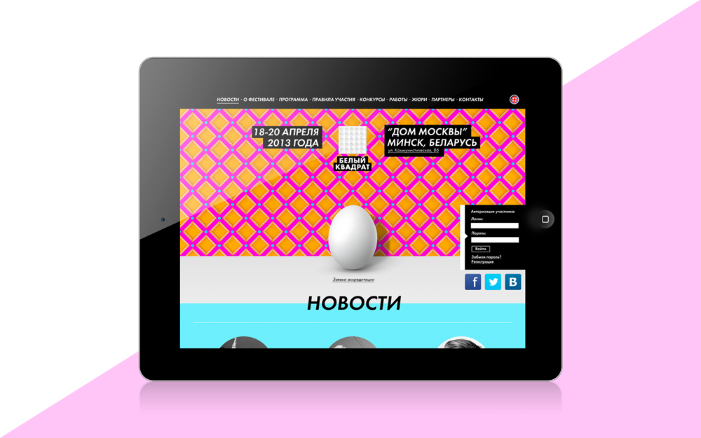 Андрей Тараканов, креативный директор Tomatdesign: «В этом году фестиваль «Белый Квадрат» проходит в пятый раз. Это маленький юбилей, когда еще рано подводить итоги, поэтому мы решили показать сегодняшний уровень фестиваля в сравнительной степени. Это отражено в главном слогане Фестиваля «Краше! Круче! Крепче!» — это то, каким стал фестиваль, его участники, а так же то, каким может стать тот, кто посетит образовательные программы или примет участие в соревновательной части фестиваля. В качестве ключевого образа мы предложили использовать яйца. Ну, во-первых, это красиво…А во-вторых, этот образ наиболее емко отражает рост фестиваля, и недвусмысленно приглашает всех принять участие в одном из наиболее статусных рекламных фестивалей СНГ»