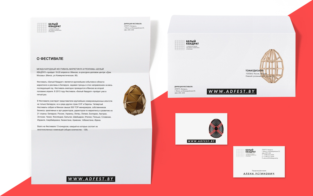 В этом году фирменный стиль Международного Фестиваля маркетинга и рекламы «Белый Квадрат» разработан рекламным агентством Tomatdesign, Россия.
