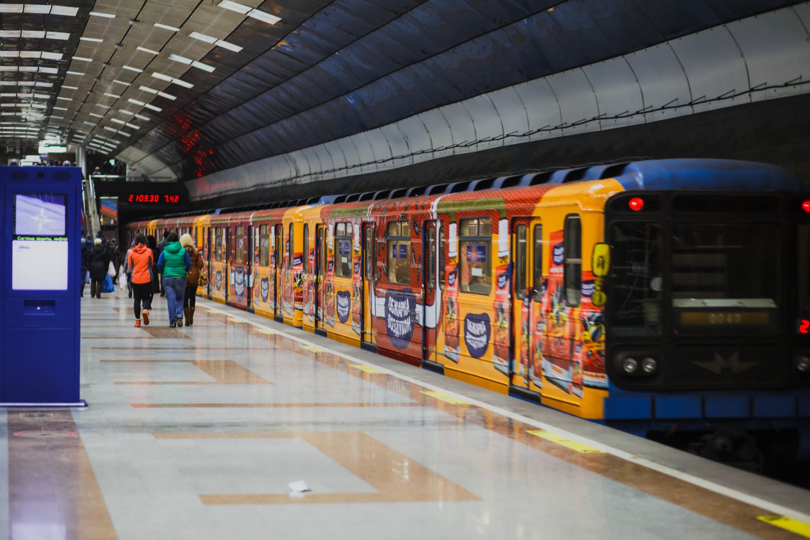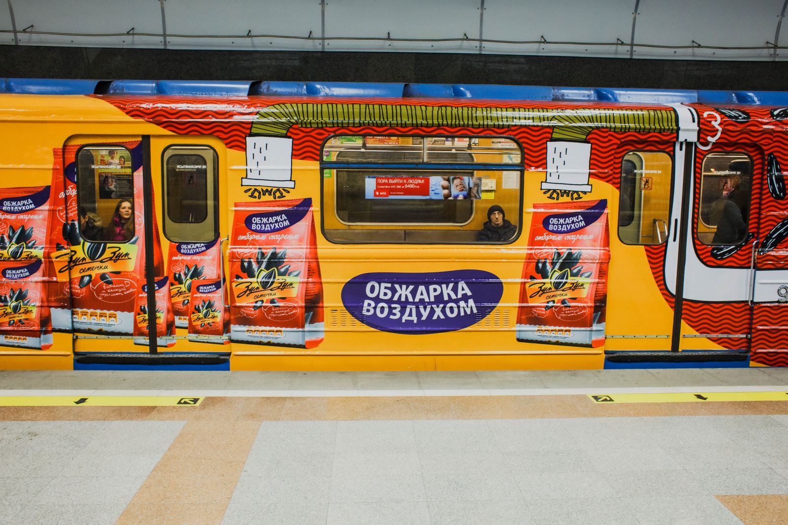 На прошлой неделе в новосибирском метрополитене появился ещё один состав с внешним брендированием вагонов. На этот раз клиентом ГК «Реклама Онлайн» стал бренд семечек «Зум-Зум».