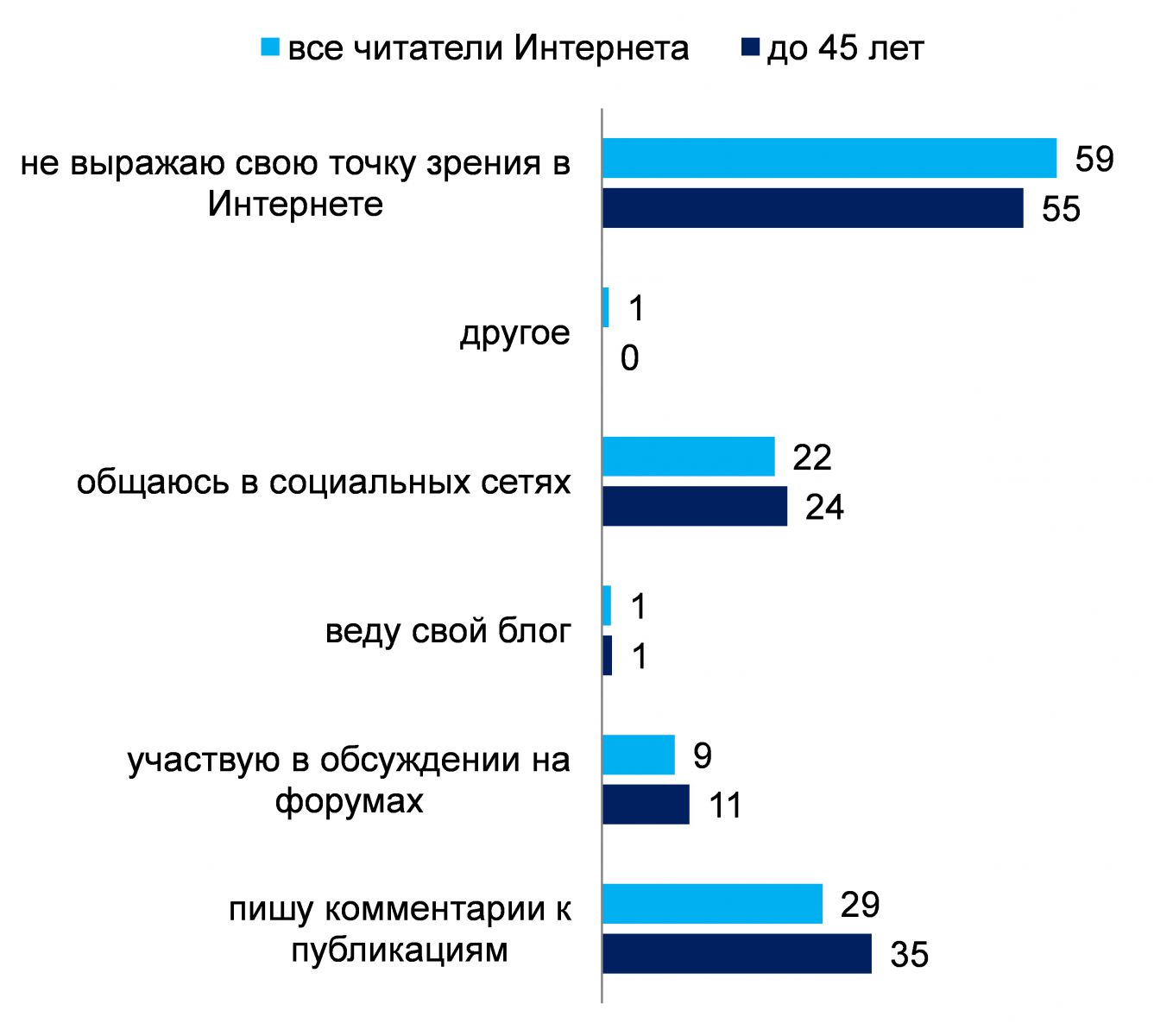 Однако большинство опрошенных неактивны в интернет-общении: 59% интернет-читателей ответили, что никак не выражают свою точку зрения, 28,7% пишут комментарии к статьям, 22,5% выражают свое мнение в общении через социальные сети, 9,47% участвуют в обсуждении на форумах.