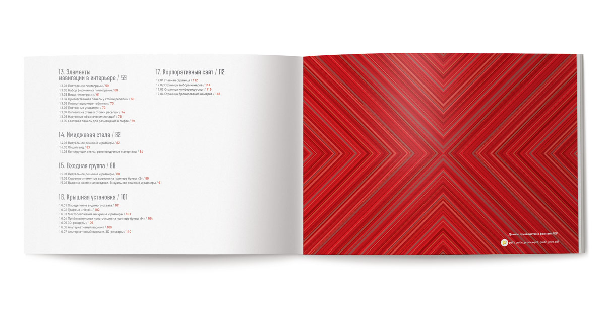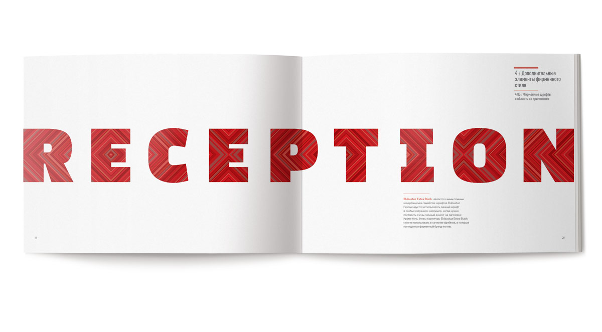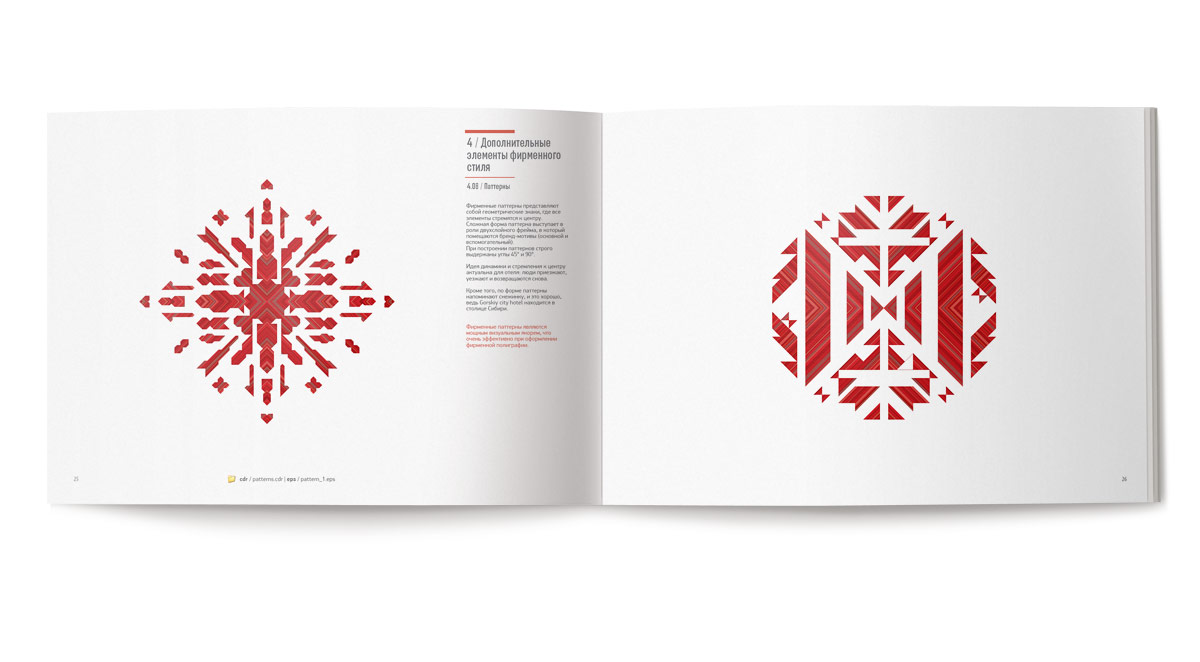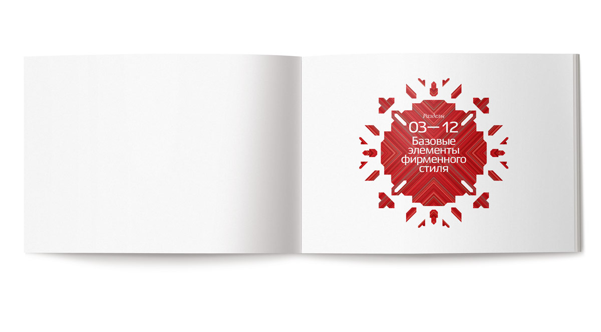 Бренд-мотив представляет собой симметричную комбинацию диагональных полос различной ширины и цветов. Орнамент содержит динамику движения в направлениях «центр-периметр».