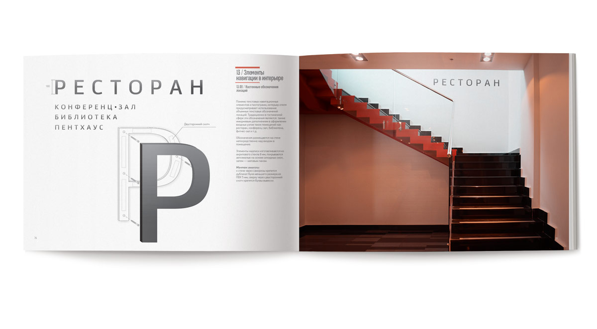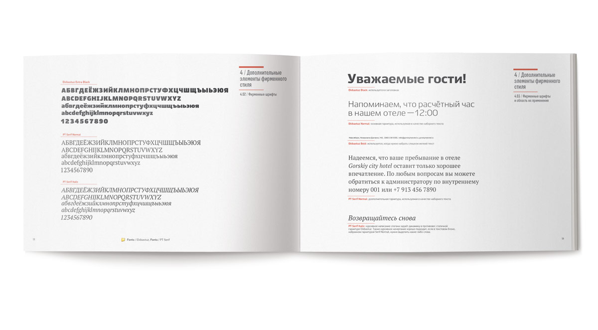 Авторское шрифтовое начертание «Gorskiy city hotel» разработано специально для логотипа. Шрифт представляет собой закрытый гротеск с оригинальным решением внутренних просветов, сочетающих плавные скругления и прямые углы. Тем самым достигается современная форма знаков. Это решение также апеллирует к геометрии знака, содержащей сочетание прямых и скругленных форм.