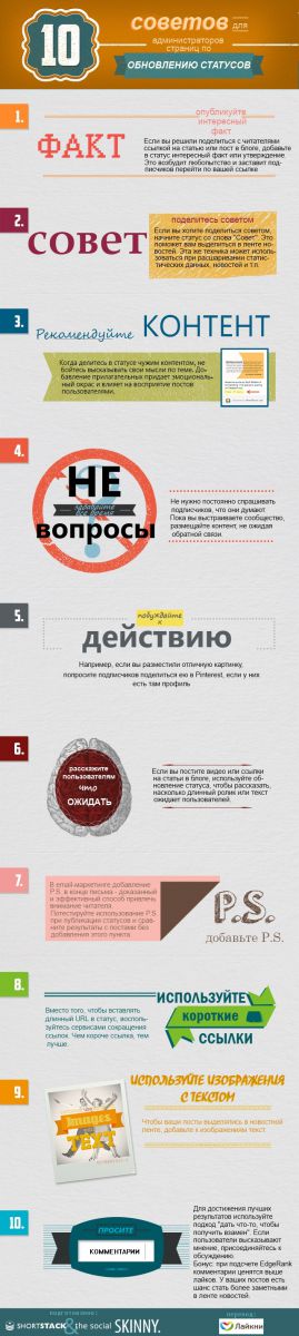 Администраторам Страниц приходится ежедневно выполнять рутинную работу – обновлять статусы и размещать посты в социальных сетях. Как это сделать правильно и вовлечь как можно больше пользователей? Компания ShortStack подготовила инфографику, в которой дает десять советов: