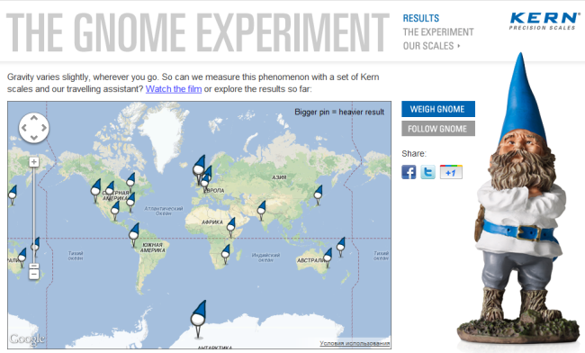 В качестве «подопытного» объекта взвешиваний был выбран гном. Немецкая компания не просто так остановила на нем свой выбор – именно в Германии в 19 веке появились первые фигурки садовых гномов, которые затем распространились по всему миру. Такая ассоциация была компании только на руку с точки зрения повышения узнаваемости бренда. К тому же благодаря фильму «Амели», где садовый гном путешествовал по всему миру, идея была уже знакома людям, что только способствовало их вовлечению и активности.