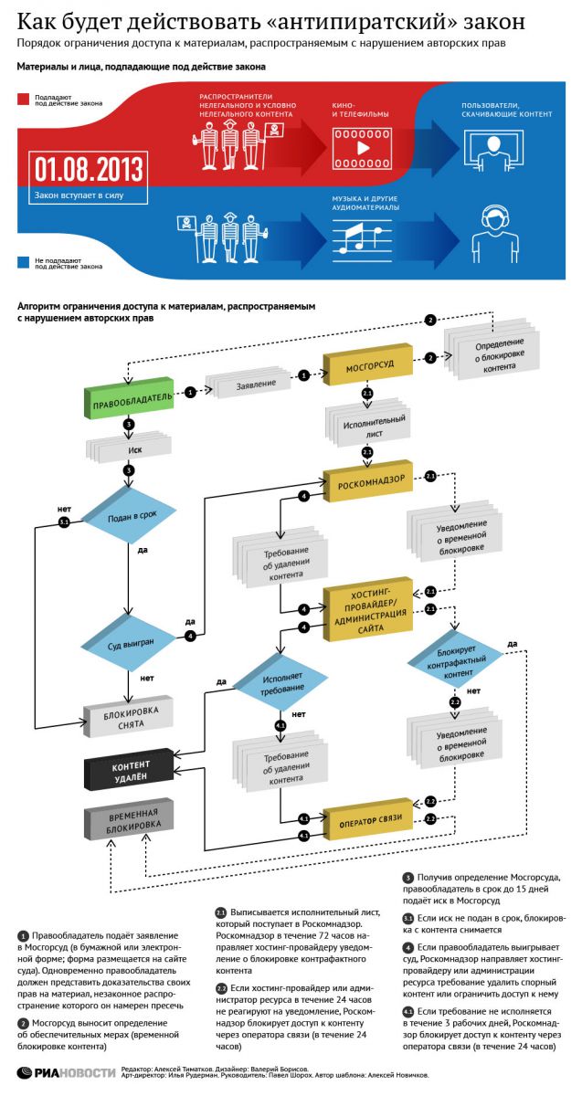 Вчера на территории России вступил в действие «антипиратский закон». Смотрим инфографику о механизме действия данной юридической нормы.
