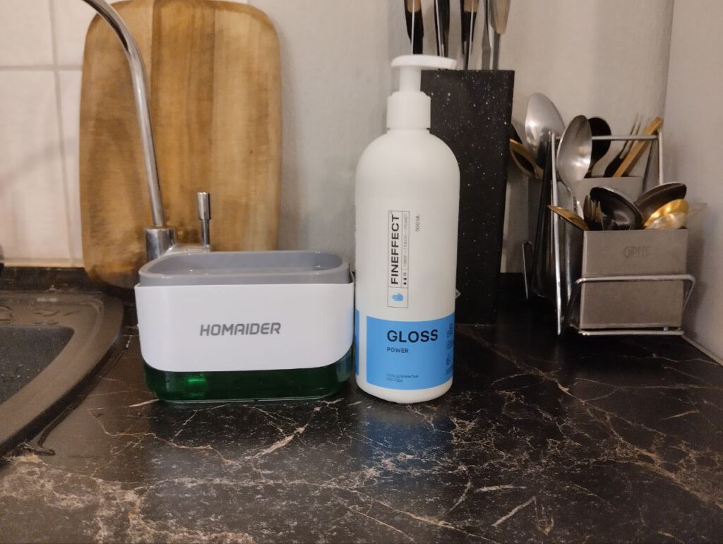 Почитав другие отзывы о Gloss power Fineffect, мы с удивлением узнали что у него хороший дозатор. Дозатор конечно хорощий и милый, но мы решили приобрести другой дозатор, вы можете видеть его на фото. Поэтому переливаем Gloss power в новый дозатор и пользуемся уже им. Дозатор кстати классный, позволяет моющее средство распределить по всей губке!